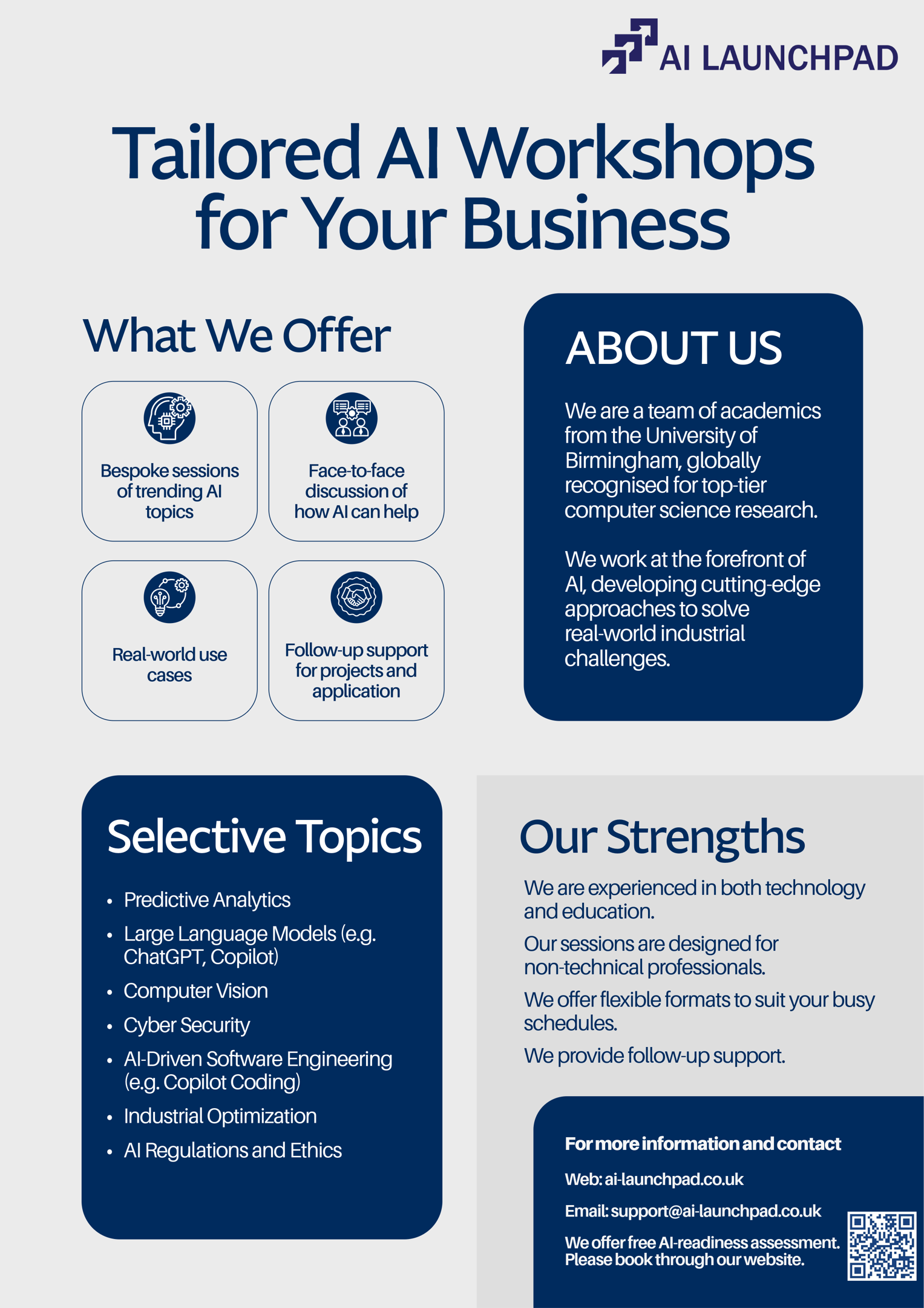 We deliver tailored workshops designed specifically for organisations and companies seeking to under how AI impacts their industry and drive sustainable business growth.